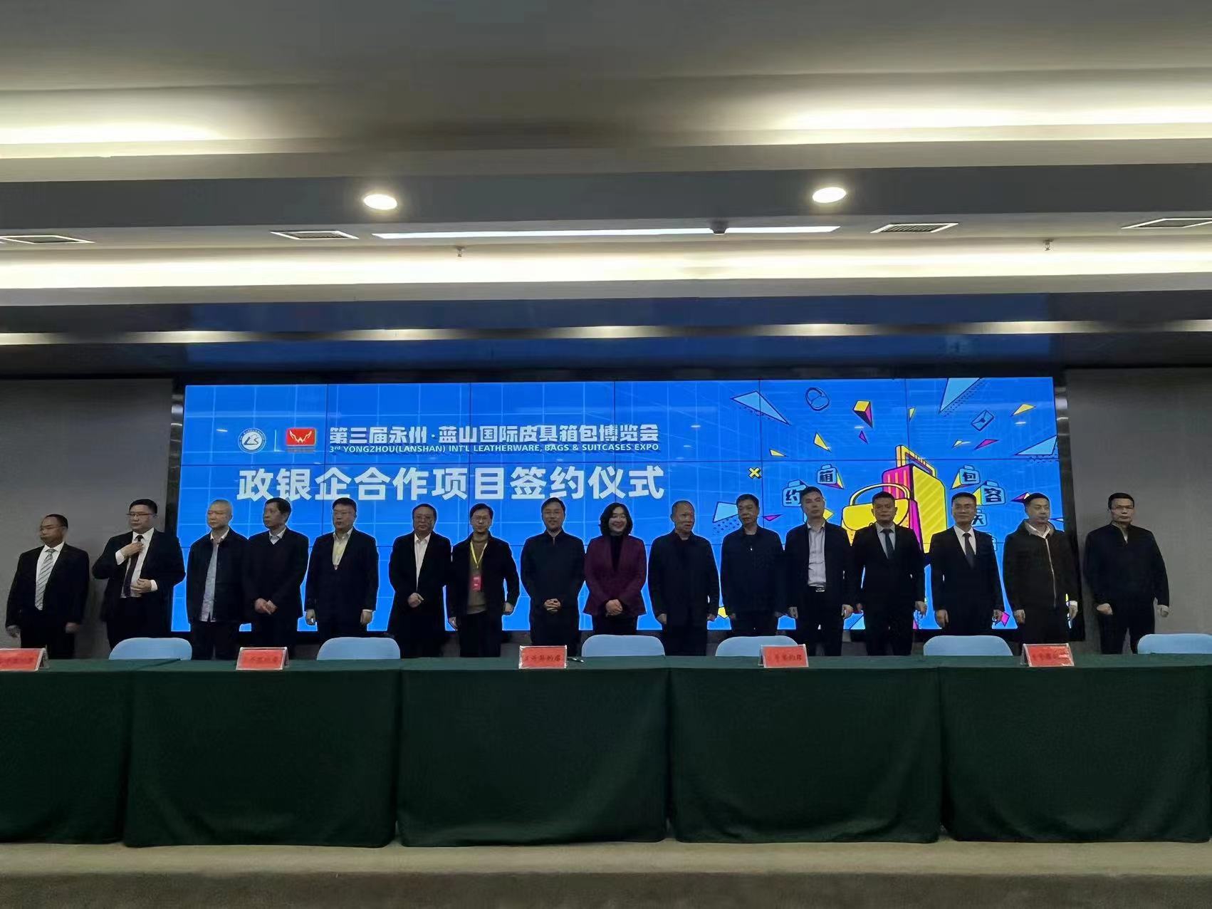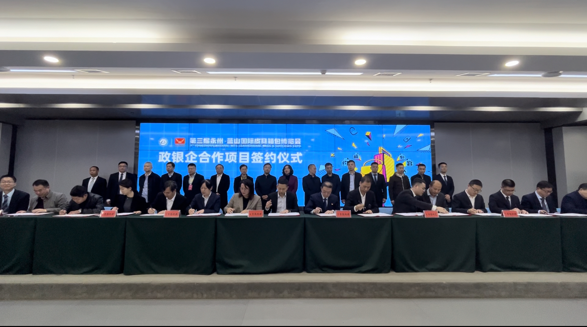 3月24日上午,第三屆永州·藍(lán)山國際皮具箱包博覽會(huì)開幕后,藍(lán)山縣舉行政銀企合作項(xiàng)目簽約儀式。永州市政府副秘書長肖瀟、永州市人民銀行中心支行行長王一凡、永州市銀保監(jiān)分局二級(jí)調(diào)研員李樹屏、永州市優(yōu)化辦主任文貽榮、永州市各銀行機(jī)構(gòu)主要負(fù)責(zé)人以及藍(lán)山縣委副書記、縣長鄧群,縣委常委、常務(wù)副縣長張國材,副縣長劉建軍等領(lǐng)導(dǎo)參加了儀式。