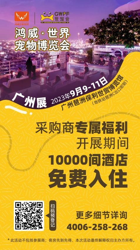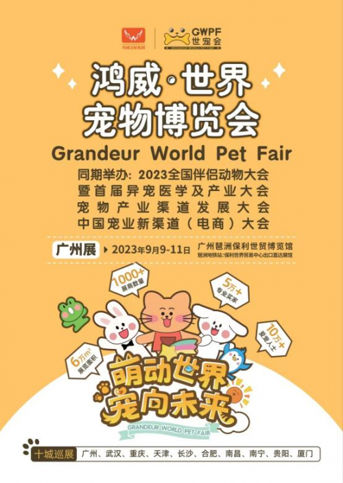 2023年9月9日-11日,廣州保利世貿(mào)博覽館,10萬+愛寵人士和5萬+采購商都會來的鴻威?世界寵物博覽會(GWPF世寵會),熱忱期待您的加入,和我們一起見證國內(nèi)寵業(yè)品牌的誕生與成長,多城聯(lián)動,商貿(mào)交流,對話全球,加速國際化戰(zhàn)略進(jìn)程,共筑引領(lǐng)世界風(fēng)向的寵業(yè)新標(biāo)桿!