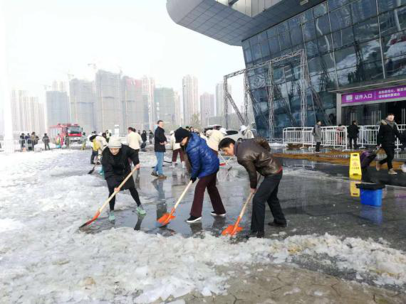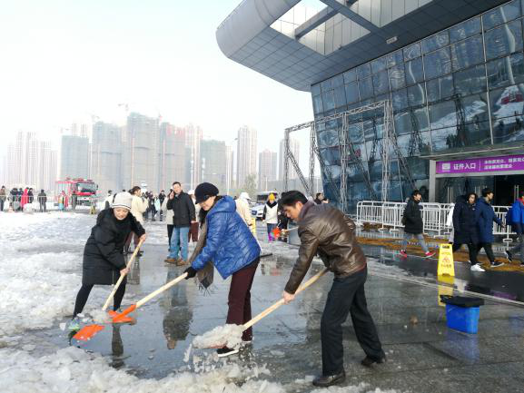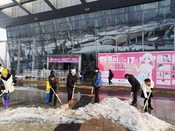 為了現(xiàn)場的人員安全,2018年12月31日清早,漢陽區(qū)會展和物流中心主任李明紅、副主任牛海彤等領(lǐng)導(dǎo)帶頭在武漢國際博覽中心開展了鏟雪除冰活動,清除展館B0登錄廳外路面積雪,消除安全隱患。大家拿著準(zhǔn)備好的鐵锨、推車、大掃帚等工具,在零下的溫度,冒著刺骨的寒風(fēng),干勁十足地揮動手中的鐵鍬和掃帚,一起鑿冰、鏟雪、掃雪,場面熱火朝天。區(qū)會展辦率先垂范,齊心協(xié)力,大家花了近一個半小時時間,清掃出展館外各主要路段的積雪。通過鏟積雪、鋪草墊、排隱患、送溫暖等舉措,確保第十七屆艾妮動漫游戲展開展期間秩序穩(wěn)定,來現(xiàn)場參與活動的人員基本未受影響。